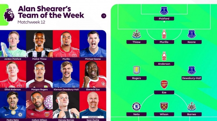 希勒评英超第12轮最好阵:皮克福德、埃泽、摩根·罗杰斯在列
