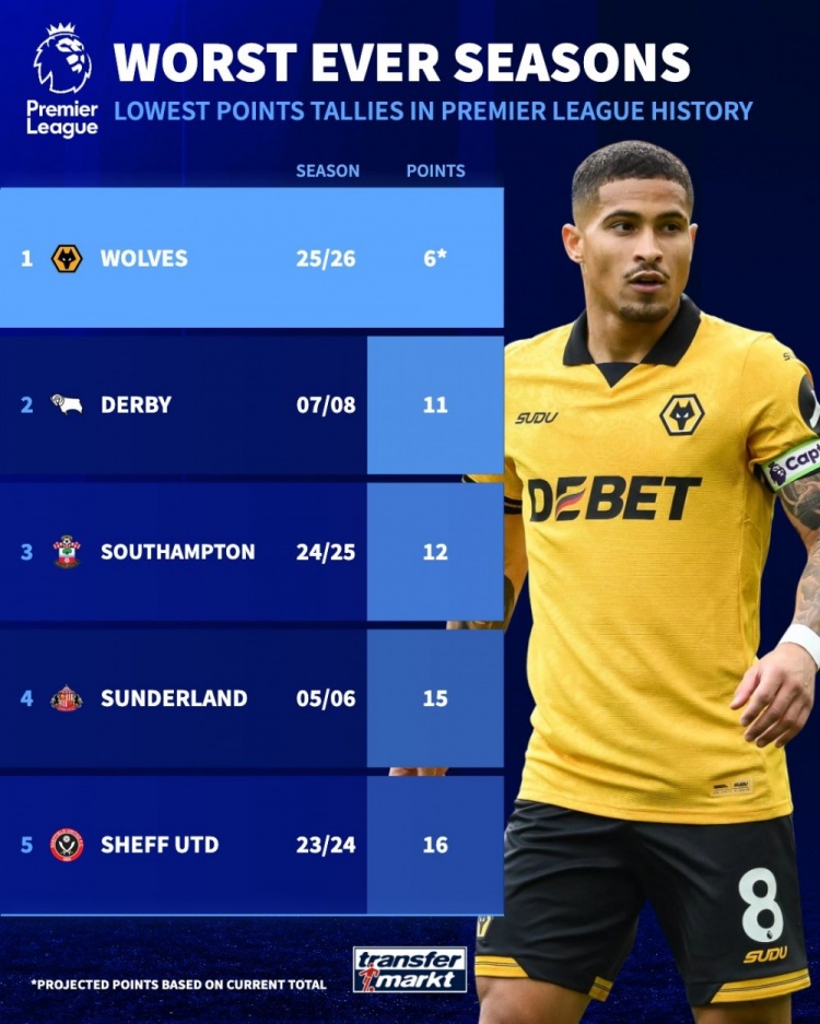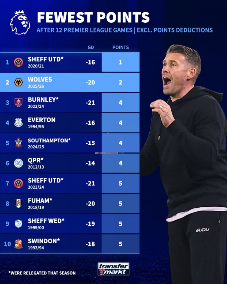 11月26日讯 狼队在本赛季推崇低迷,12轮后仅积2分,《转会市集》统计披露他们亦然英超历史同时战绩倒数第二。