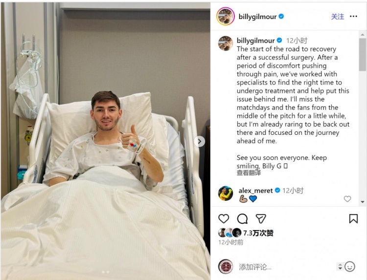 “接下来的一段日子,我会念念念比赛日和球迷们,但我已迫不足待重返赛场,并将全力专注于目前的康复征途。全球很快再会。保执含笑,比利(吉尔莫)!”