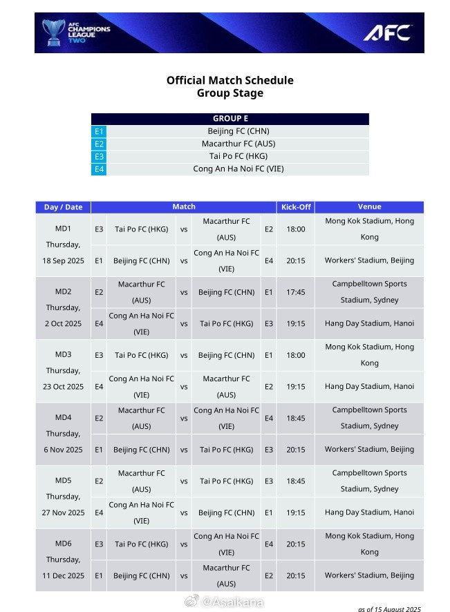 亚足联官网当天早些时候上传的亚冠二级联赛赛程更新是不正确的,北京国安的赛程骨子并未有变化(更新仅为其他小组标黄部老实容),第一场仍为主场对河内公安的比赛,预计是亚足联使命漏洞误传了漏洞版块。赛程以中国足协8月25日在官网发布的版块为准。