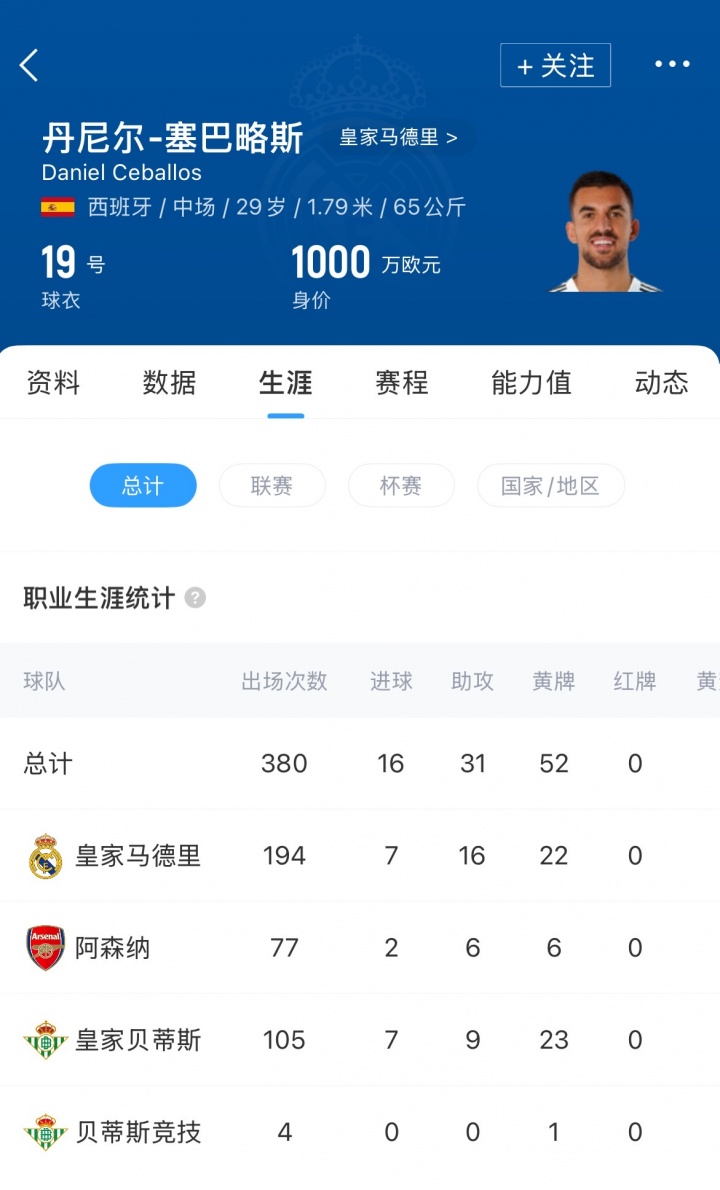 塞巴略斯现年29岁,为皇马出场194次打进7球6助,现在德回身价为1000万欧。