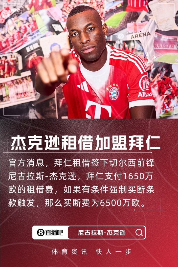 不会掉头!官方:杰克逊租出加盟拜仁 租出费1650万欧&6500万买断