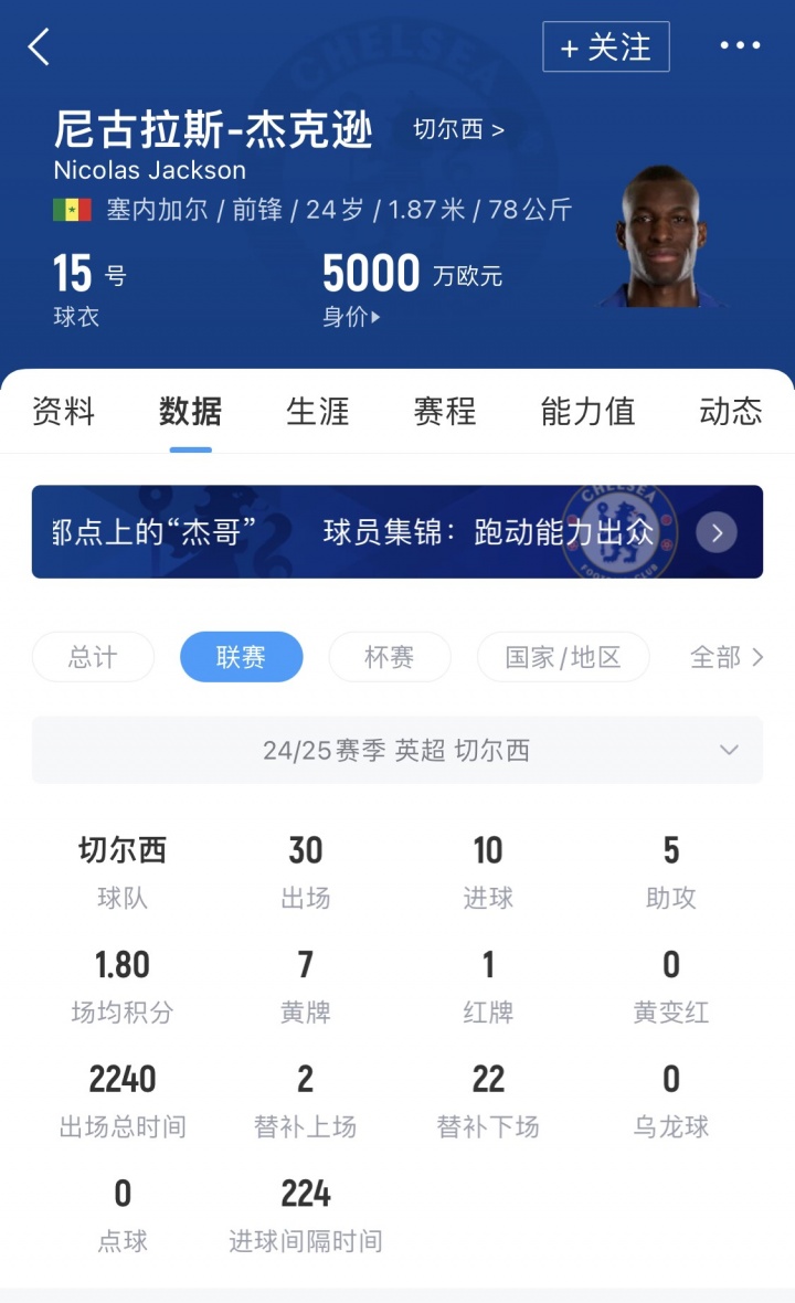 杰克逊现年24岁,当今德回身价5000万欧,切尔西2023年花费3700万欧从比利亚雷亚尔将其引进。上赛季杰克逊为切尔西出战38场得益16球5助。