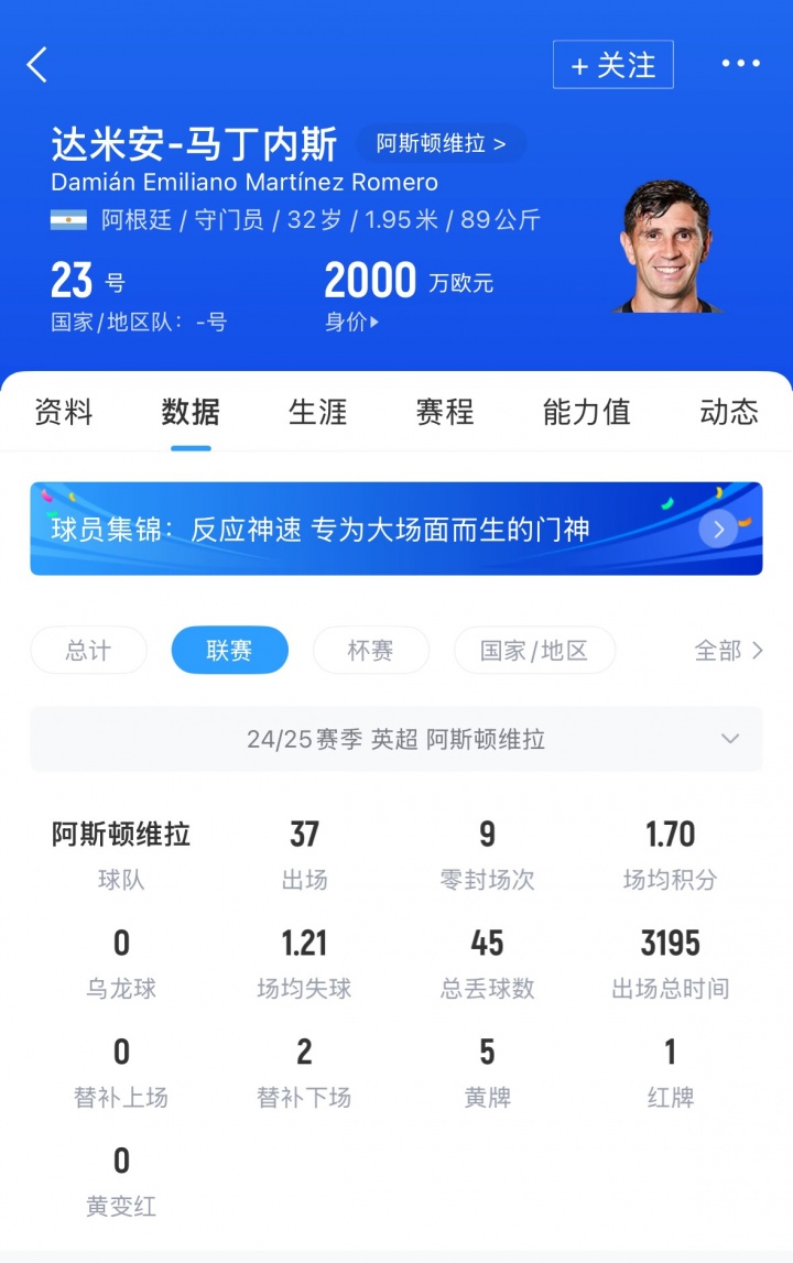 马丁内斯上赛季代表维拉英超出场37次丢45球,完成9次零封。