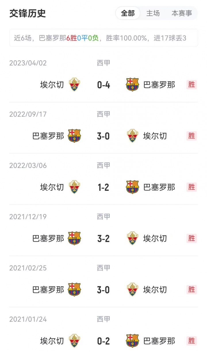赛前巴萨7胜1平2负,积22分名次西甲第3;埃尔切3胜5平2负,积14分名次西甲第8。两边前次交手要追思到2023年的西甲,巴萨客场4-0埃尔切。