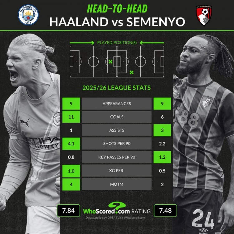 11月3日讯 本轮英超,曼城将主场对阵伯恩茅斯。赛前WhoScored列出了两队主要得离异哈兰德和塞梅尼奥的数据对比。