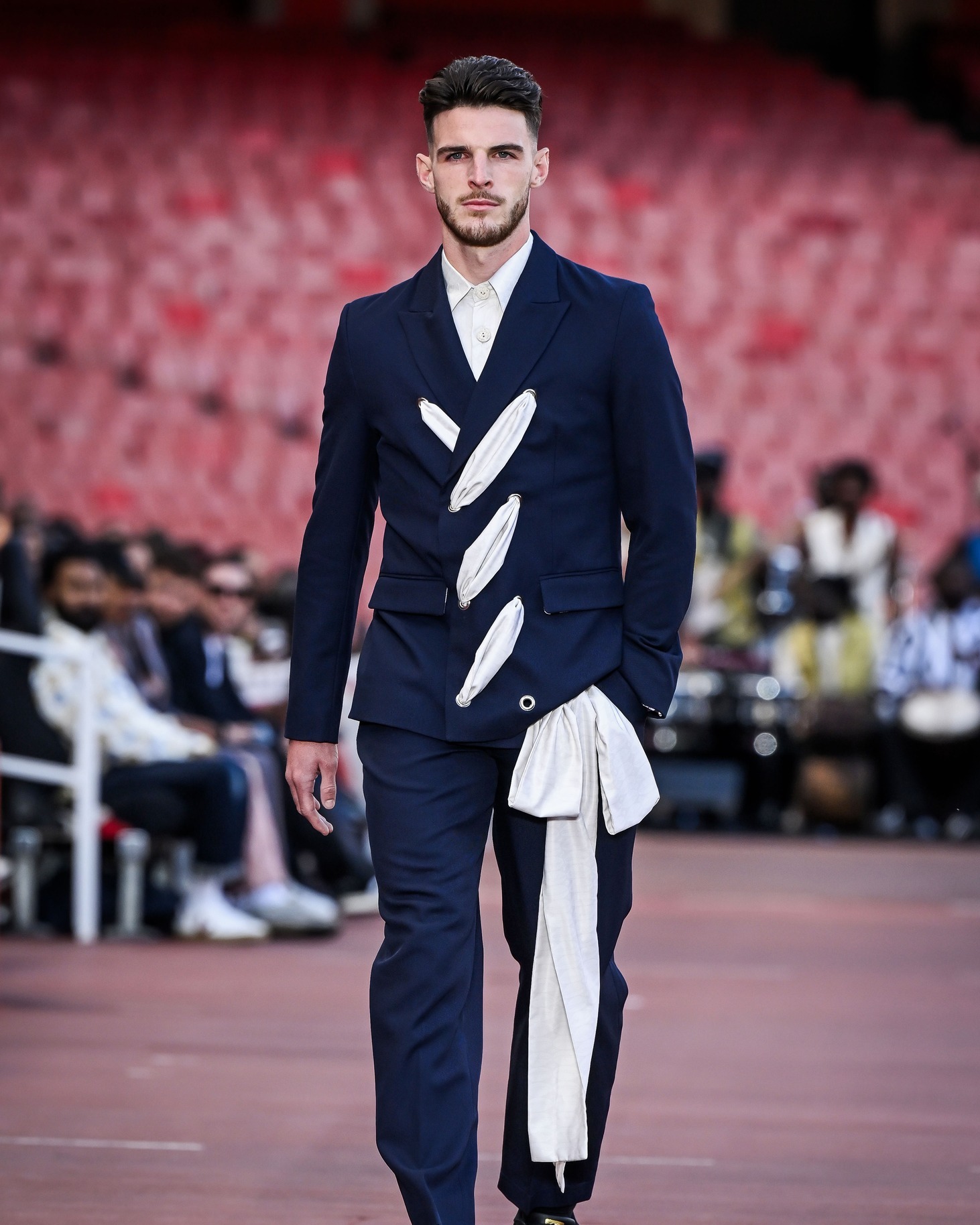 客岁9月,赖斯初度登上T台,为Labrum2025春夏系列男装走秀。这是一场场以阿森纳足球俱乐部为主题的时装秀,在酋长球场举行,赖斯身着一件修身丝带障翳西装,搭配阿迪达斯Superstar说明鞋登台。