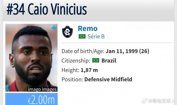 卡约现年26岁,在场上级职后腰,效能于巴乙瑞模贝雷,上赛季共出战了28场巴乙联赛,打进5球助攻2次,当今德回身价为200万欧。