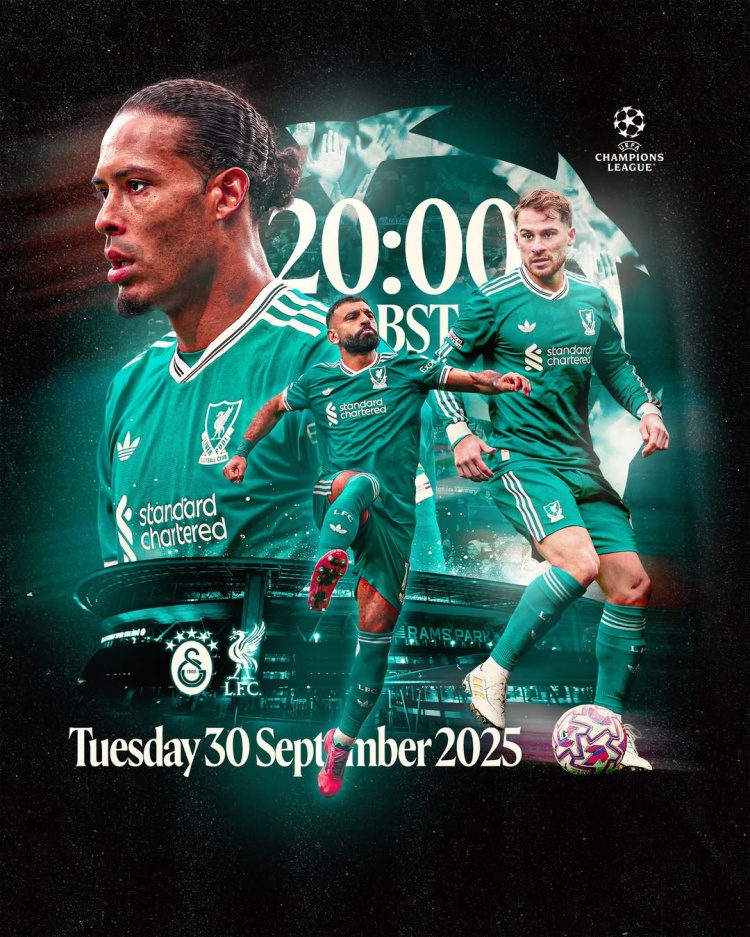 利物浦官方更新社媒动态,晒出为此役制作的海报,萨拉赫、范迪克、麦卡利斯了得镜。