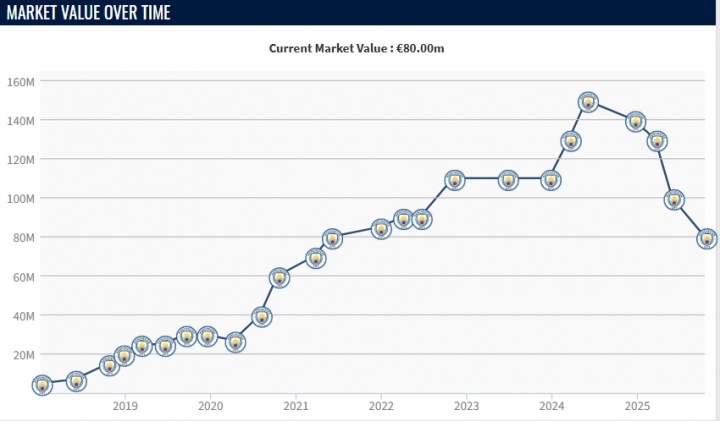 这清晰才8000万❓福登缱绻2球赛季5球3助,1年身价跌了7000万😬