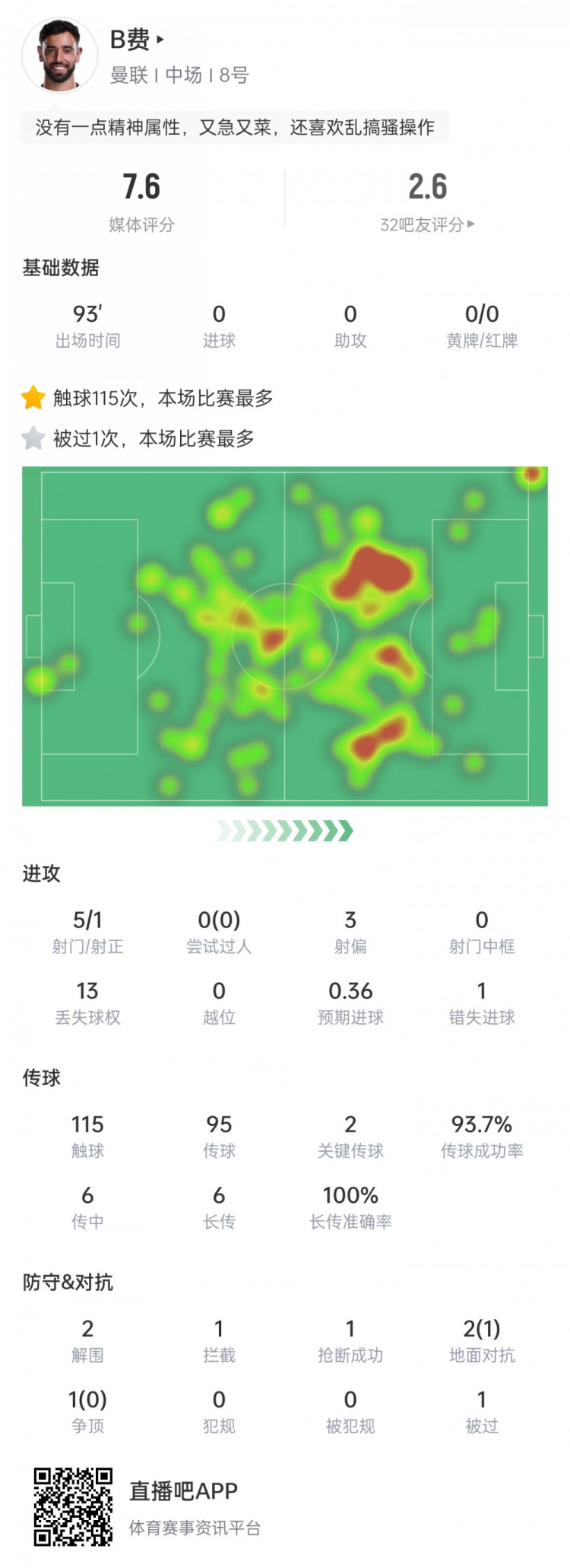 B费本场数据:触球115次全场最多,6次长传一齐得胜,获评7.6分