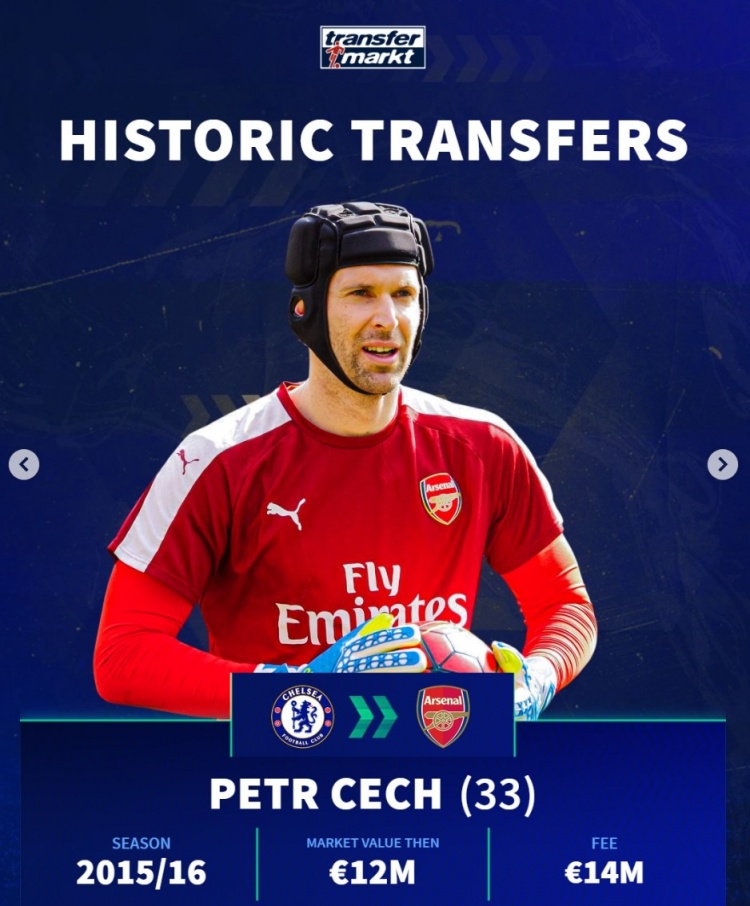 切赫(切尔西→阿森纳):33岁,15-16赛季,身价1200万,转会费1400万