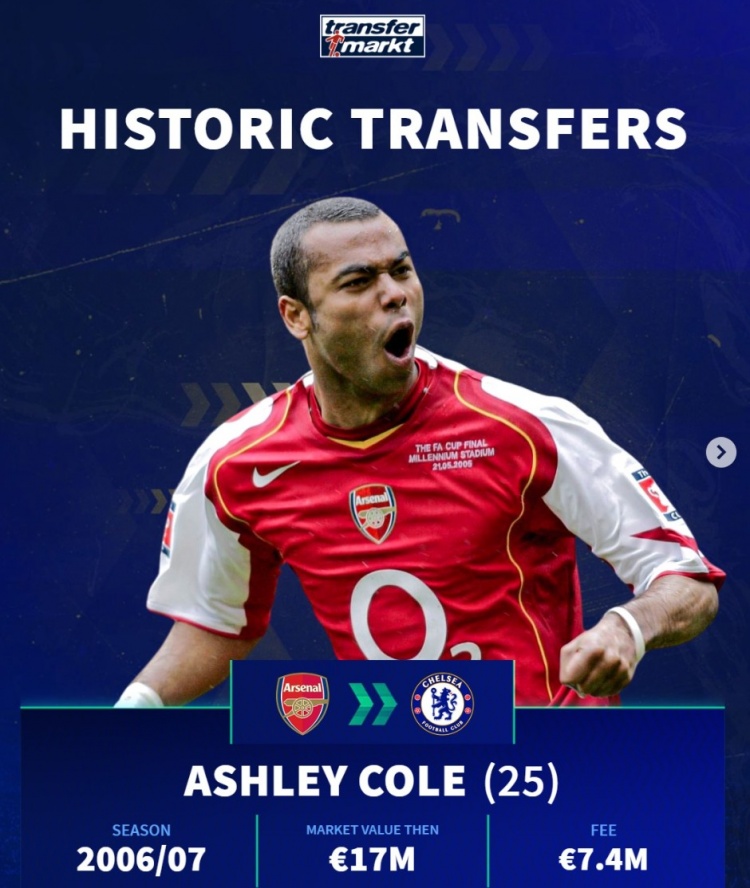 阿什利·科尔(阿森纳→切尔西):25岁,06-07赛季,身价1700万,转会费740万