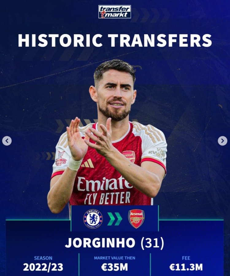 若日尼奥(切尔西→阿森纳):31岁,22-23赛季,身价3500万,转会费1130万