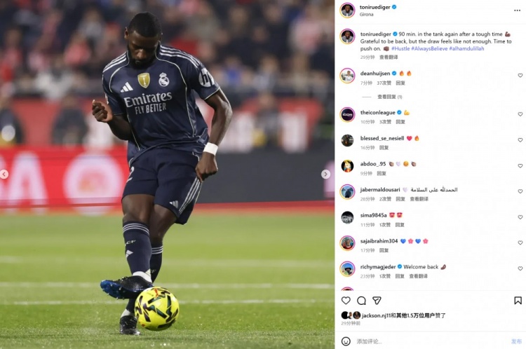 伤愈复出,吕迪格社媒晒照:感恩唐突重返赛场,但平局难言更生