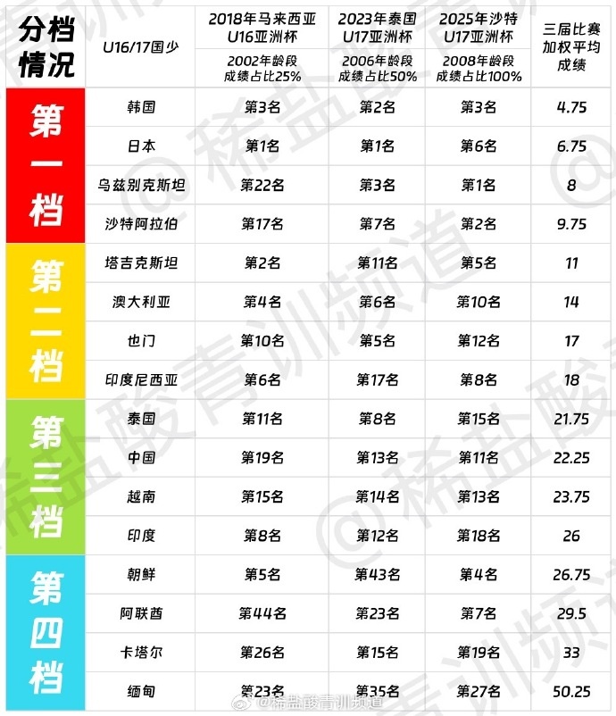12月2日讯 博主“稀盐酸青训频谈”统计了2026年U17亚洲杯分档情况,中国U17排在第三端倪。