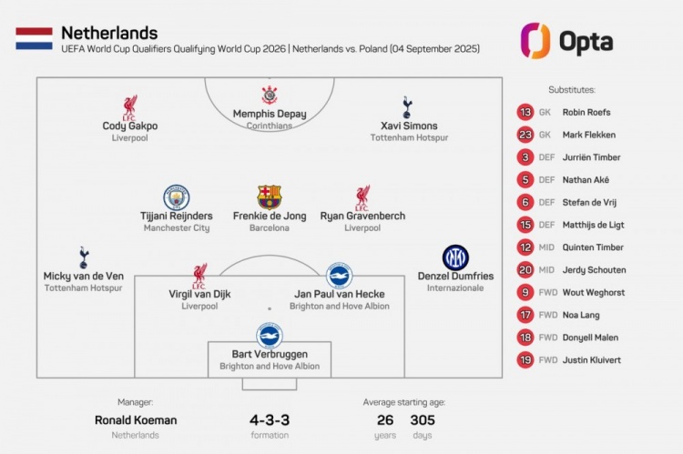 9月5日讯 荷兰在本轮世初赛主场1-1战平波兰,荷兰队本场比赛首发有8东说念主王人来自英超。