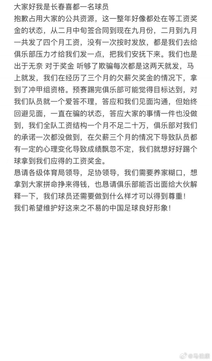 09月09日讯 中乙长春喜王人球员马伯康在社媒发文讨薪,他暗意本年签署协议后后8个月仅发了4个月工资,且奖金也一直拖欠。