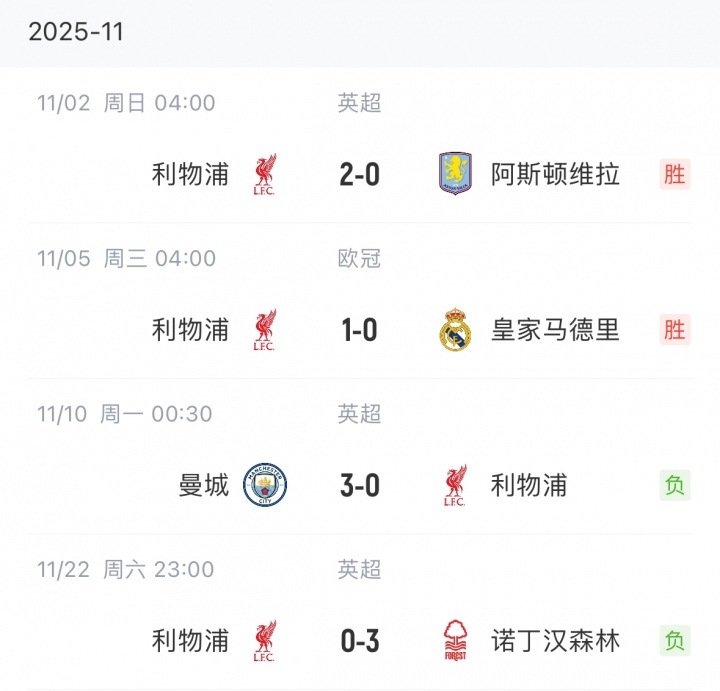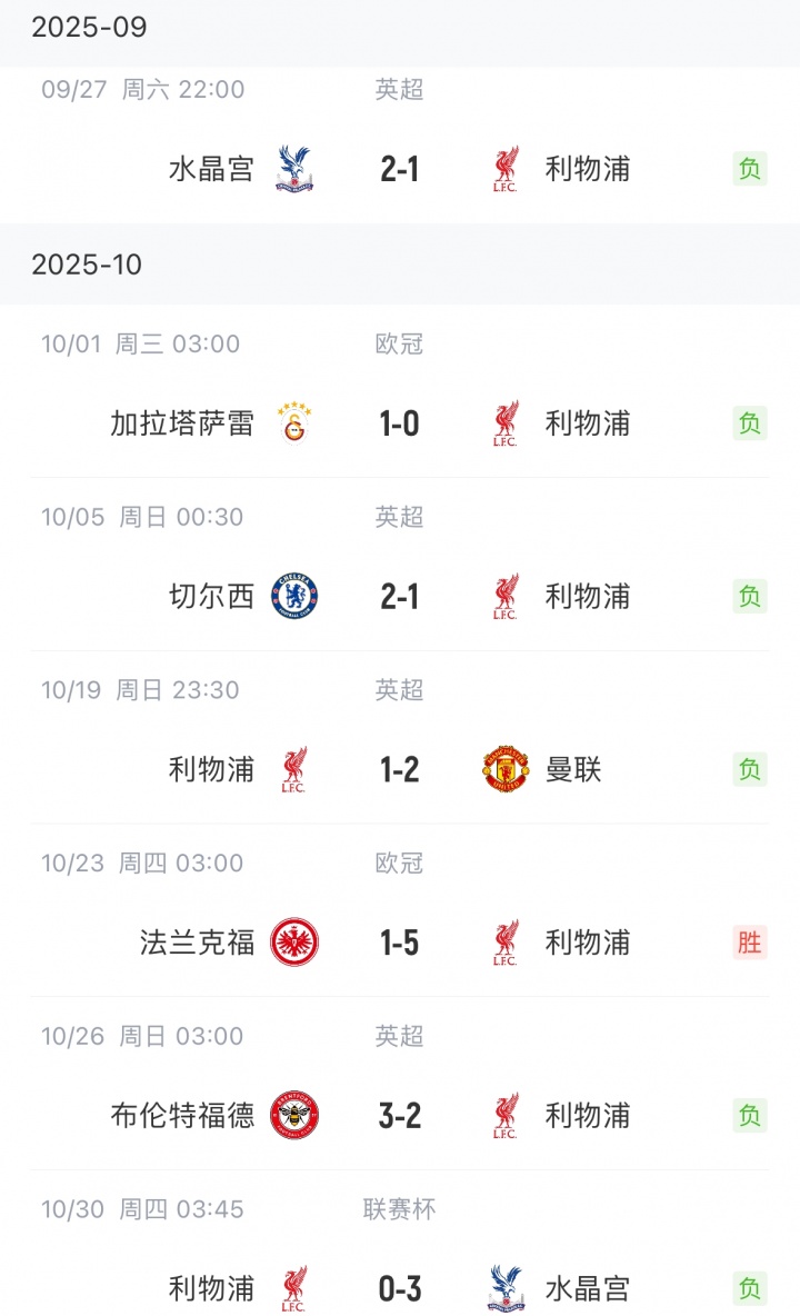 输了8场!利物浦是自9月27日以来五大联赛输球场数最多的球队