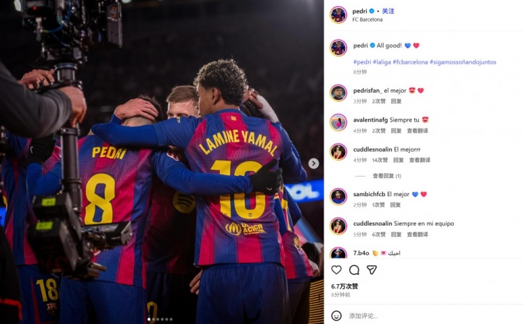 伤愈首发送助攻!佩德里社媒晒全队相拥庆祝照:一切完好!