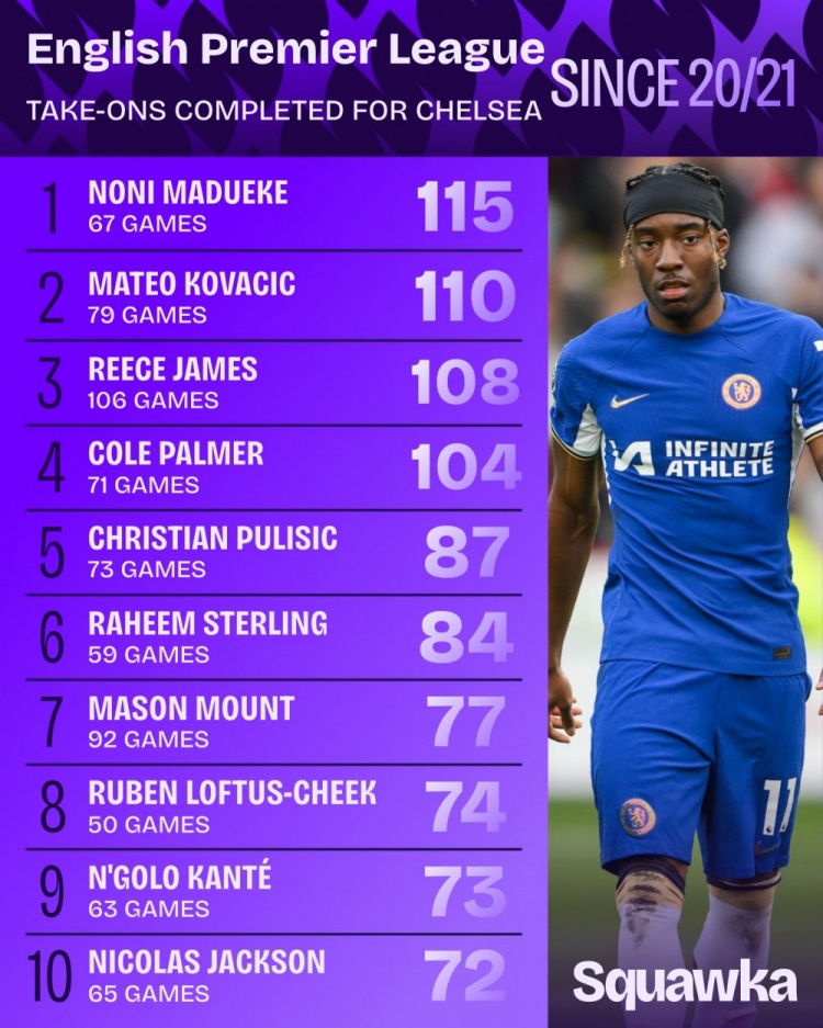 近5年蓝军过东谈主榜:马杜埃凯压科瓦西奇居首,詹姆斯&帕尔默在列