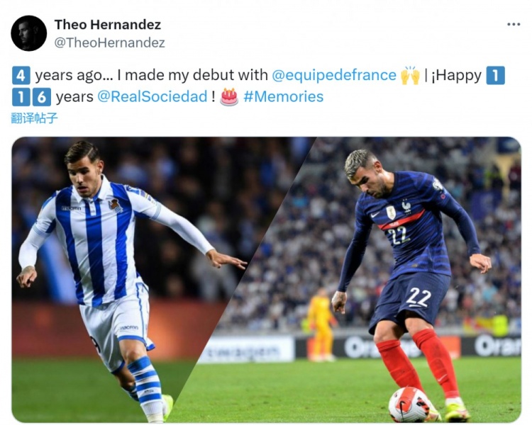 9月7日讯 特奥更新社媒动态,驰念法国队首秀4周年,并为皇家社会庆生。