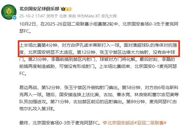 赛后,国安官方发布的战报中对丢球的原因进行了讲明:面临澳超球队的身段抗击强度,球队理会不太稳当。