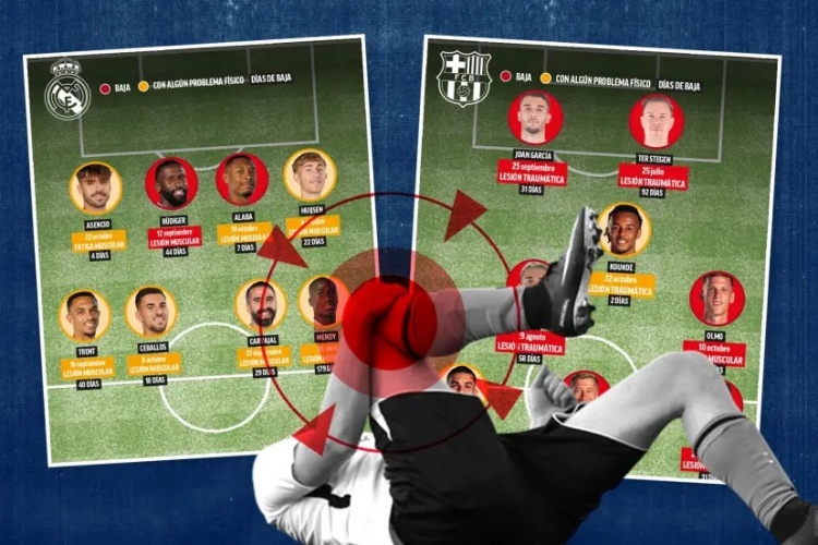 10月25日讯 据《马卡报》统计,皇马和巴萨两队野心有多达16名球员受到不同进度的肉体问题困扰。其中,皇马的吕迪格和阿拉巴,以及巴萨的特尔施特根、加维、莱万、奥尔莫、拉菲尼亚和霍安-加西亚共八东说念主已细目缺席。