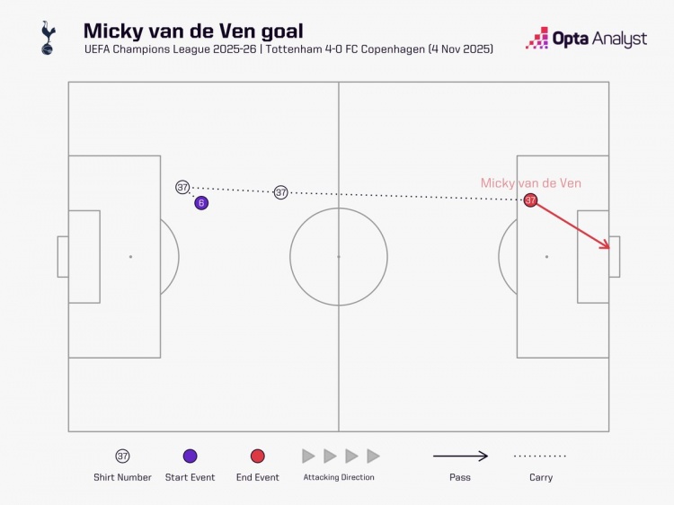 据Opta统计,范德芬带球跑动67.7米之后破门,这是2015年Opta统计关连数据以来,欧冠带球距离最远的进球。