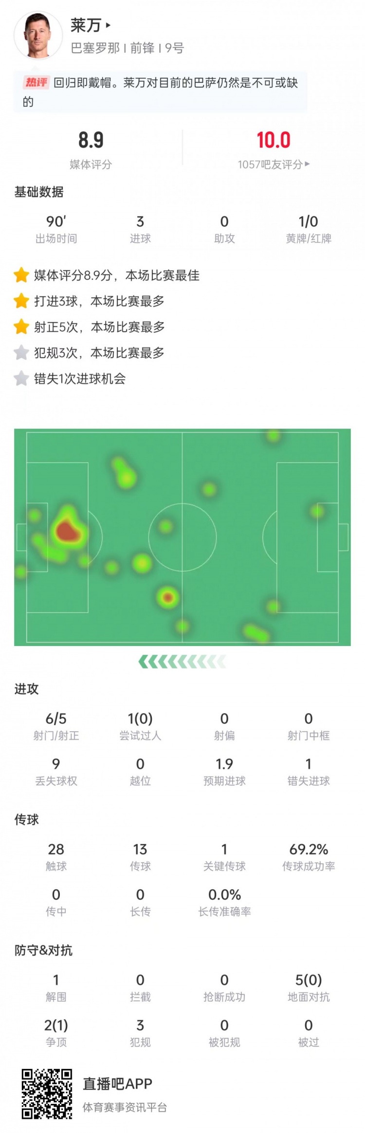 莱万本场数据:6次射门打进3球,错失1次契机,评分8.9全场最高