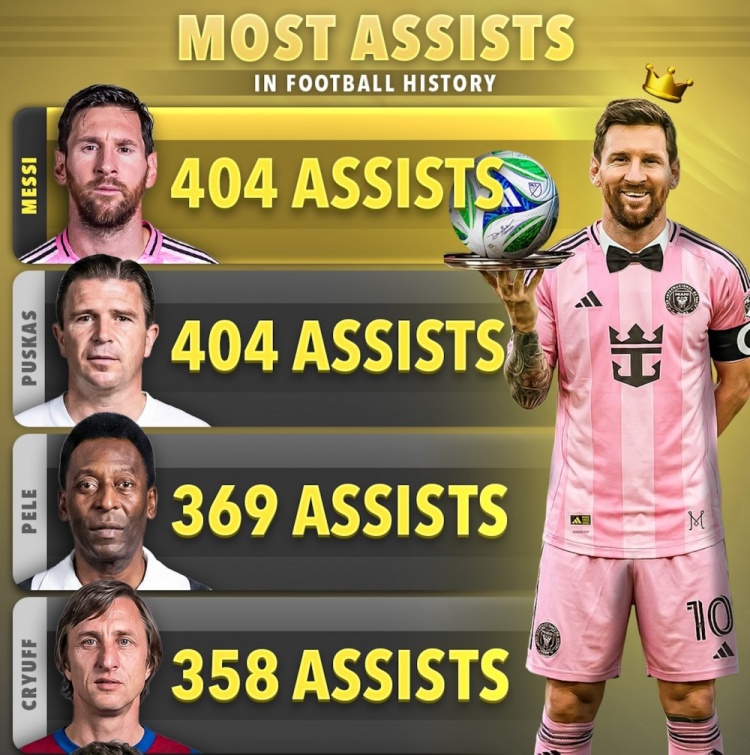 11月24日讯 好意思职联比赛,梅西1射3助不息迈阿密4-0完胜辛辛那提,晋级东部决赛。至此,梅西已劳动生存助攻数已达404次。据score90数据统计,梅西404次助攻已追平普斯卡什,两东谈主比肩天下足坛助攻榜榜首。