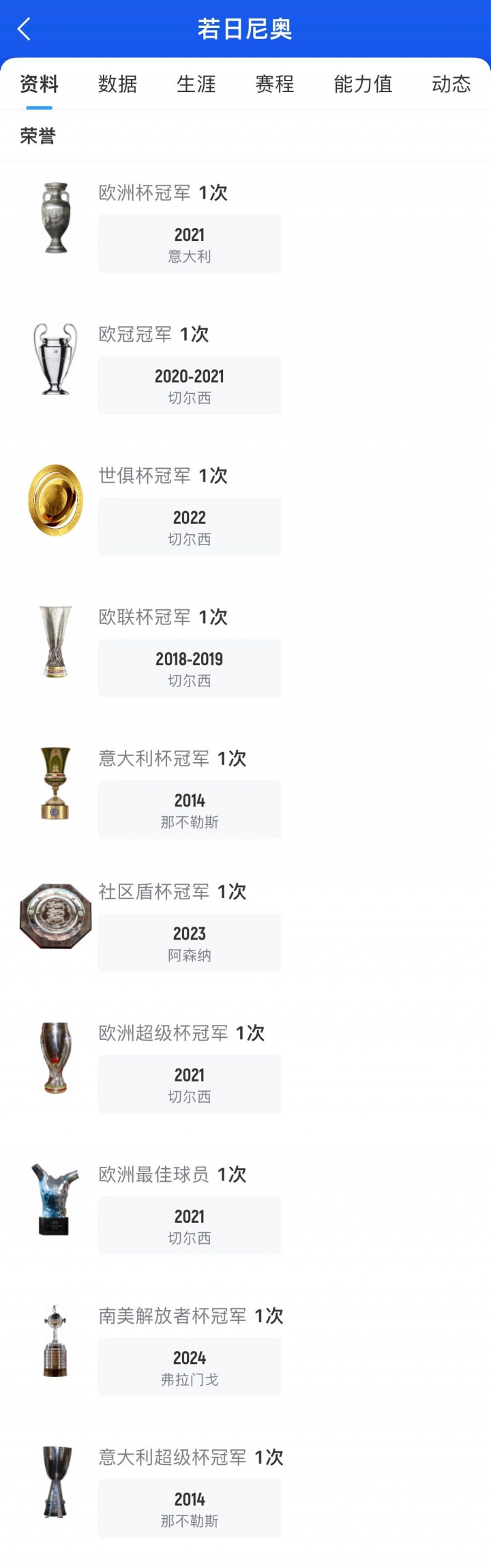 2021年是若日尼奥行状生计巅峰期,他匡助切尔西赢得欧冠冠军,为意大利赢得欧洲杯冠军,在以前的金球奖名次中,若日尼奥排在第三位。