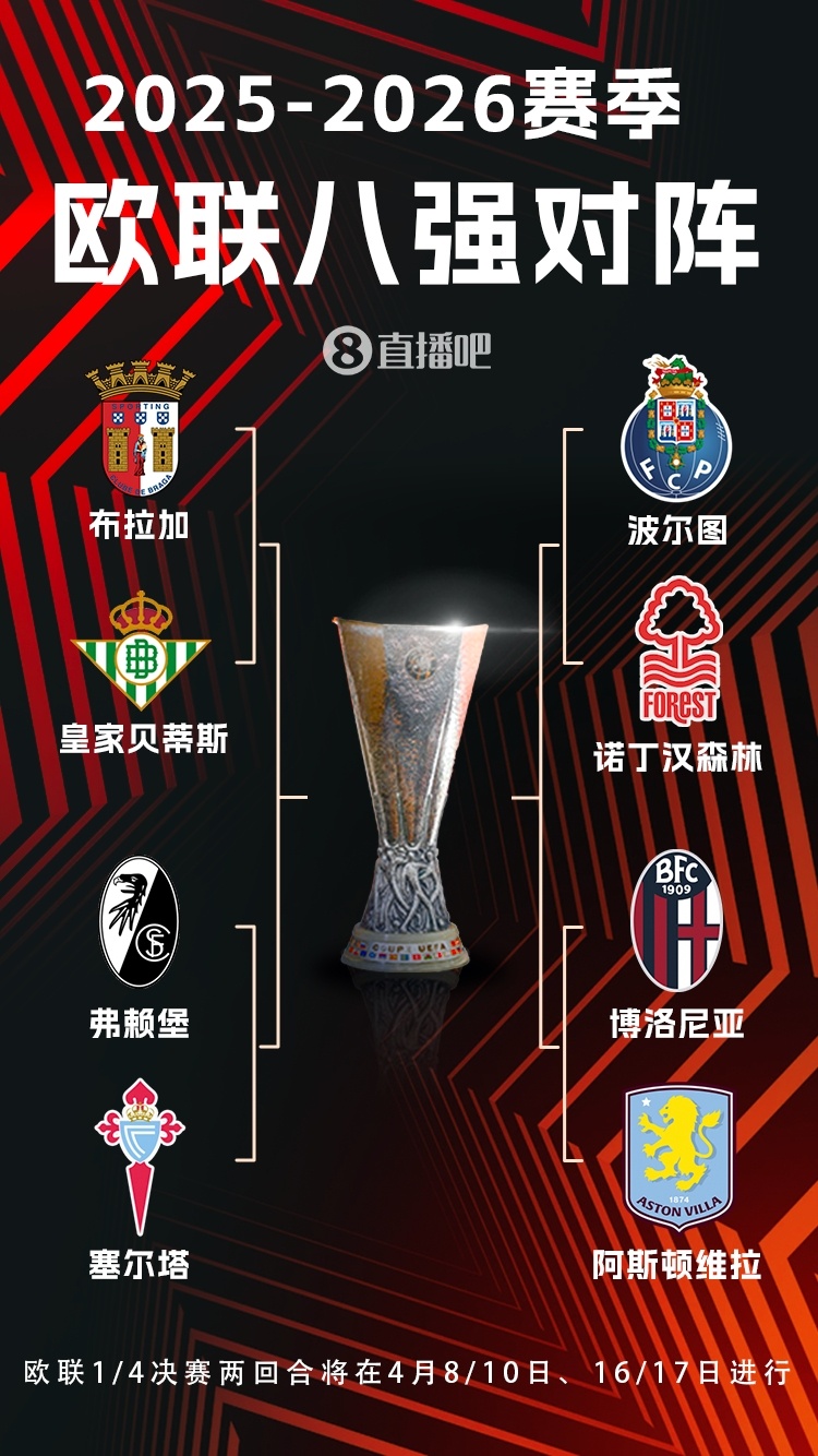 25-26比联赛季欧联八强:罗马出局!博洛尼亚将战维拉,波尔图碰森林
