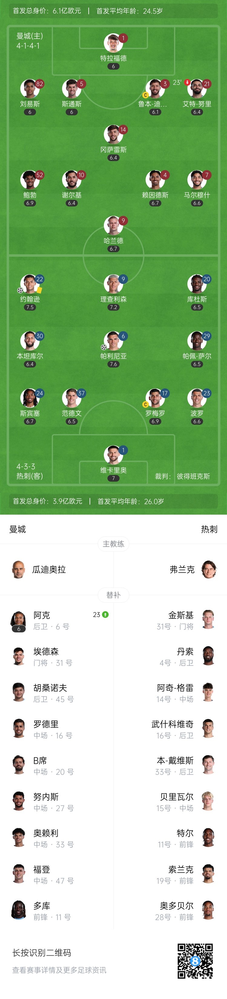 第35分钟,理查利森右路接球杀到禁区边,横传禁区内,布伦南-约翰逊包抄破门!边裁默示越位,但VAR改判进球灵验!热刺1-0率先曼城↓