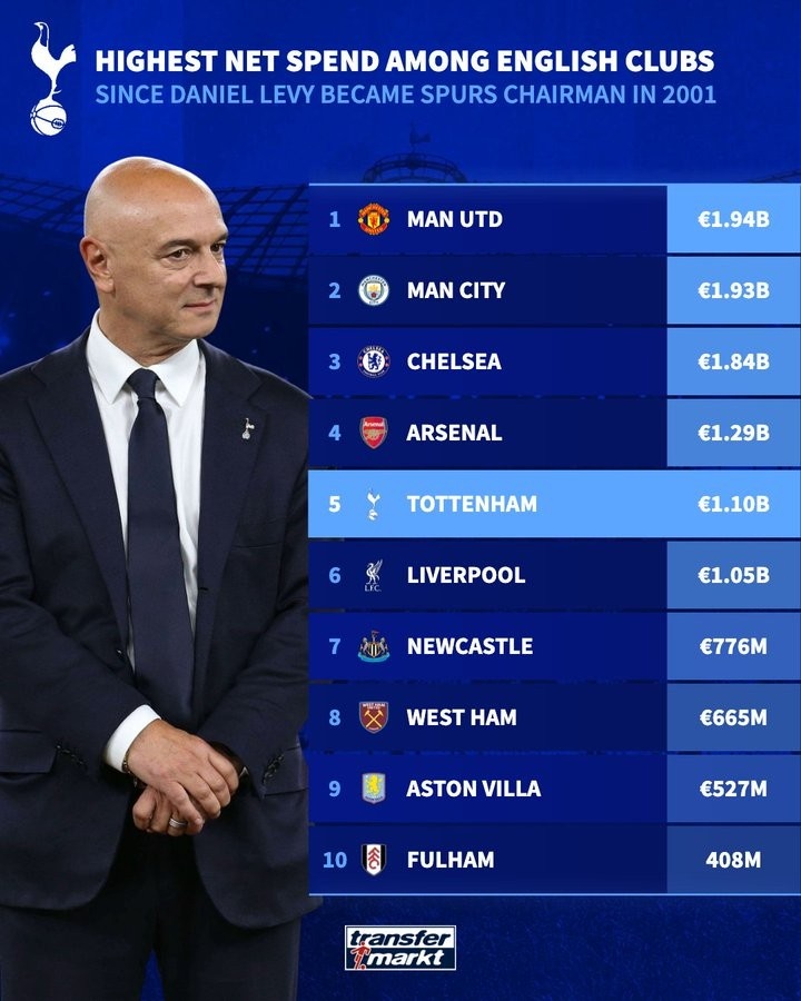 列维01年入主热刺于今转会净开销11亿欧,同时英格兰球队第五